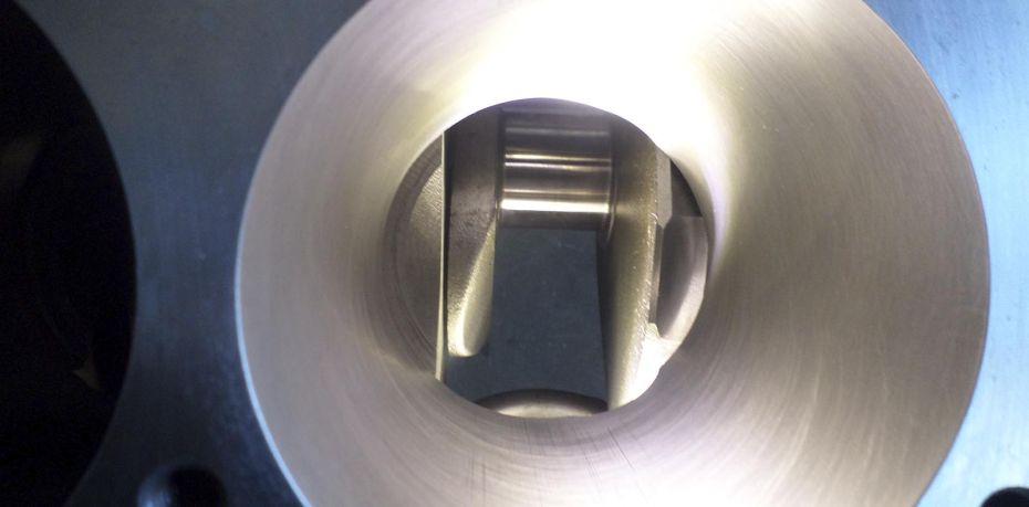 Die Zylinderblöcke (hier ein einzelner Zylinder) sind gebohrt und mit Vorspannplatte (torque plate) gehont.