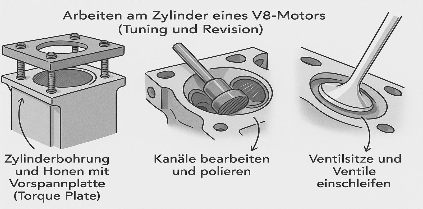 Bei der Überarbeitung oder Leistungssteigerung (Tuning) eines V8-Motors sind bestimmte Arbeiten an den Zylindern und dem Zylinderkopf besonders wichtig. Hier ein Überblick: